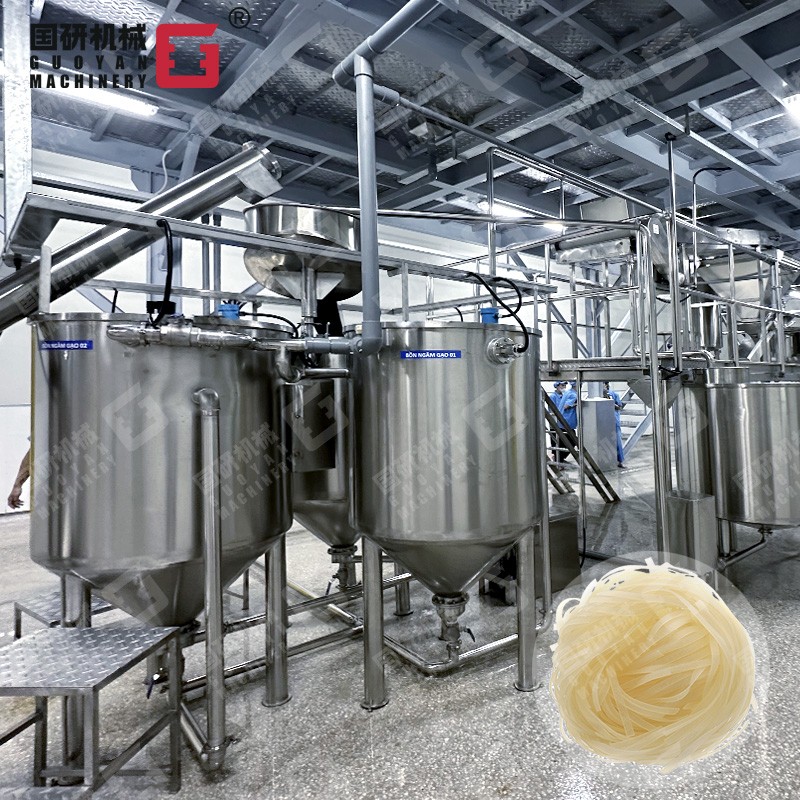 大米→射流提升輸送→除砂石→射流洗米、浸米→米水分離→磨漿→篩濾→儲漿→蒸粉片→粉片預(yù)干→低溫自動吊掛老化→自動切條、切斷→定重壓形→干燥→包裝→成品
